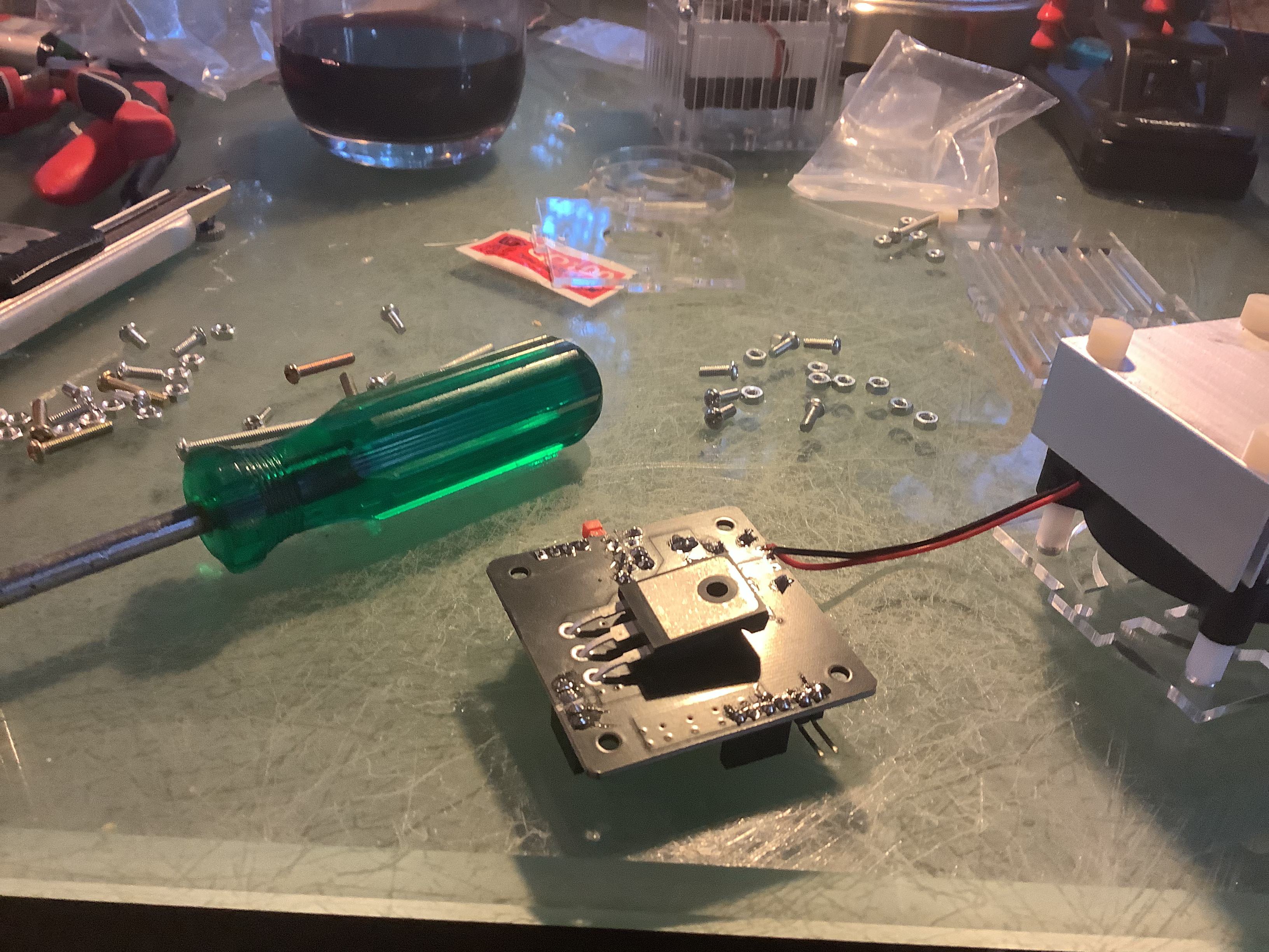 The driver PCB has a few more components, as well as a lot of surface-mounted components already installed (thank goodness we don’t need to solder those!) I’d recommend starting with the power supply and power button. Add both to the PCB and solder them from below. Test continuity using a multimeter - it’s easy to give too much solder to the switch and too little to the power socket.