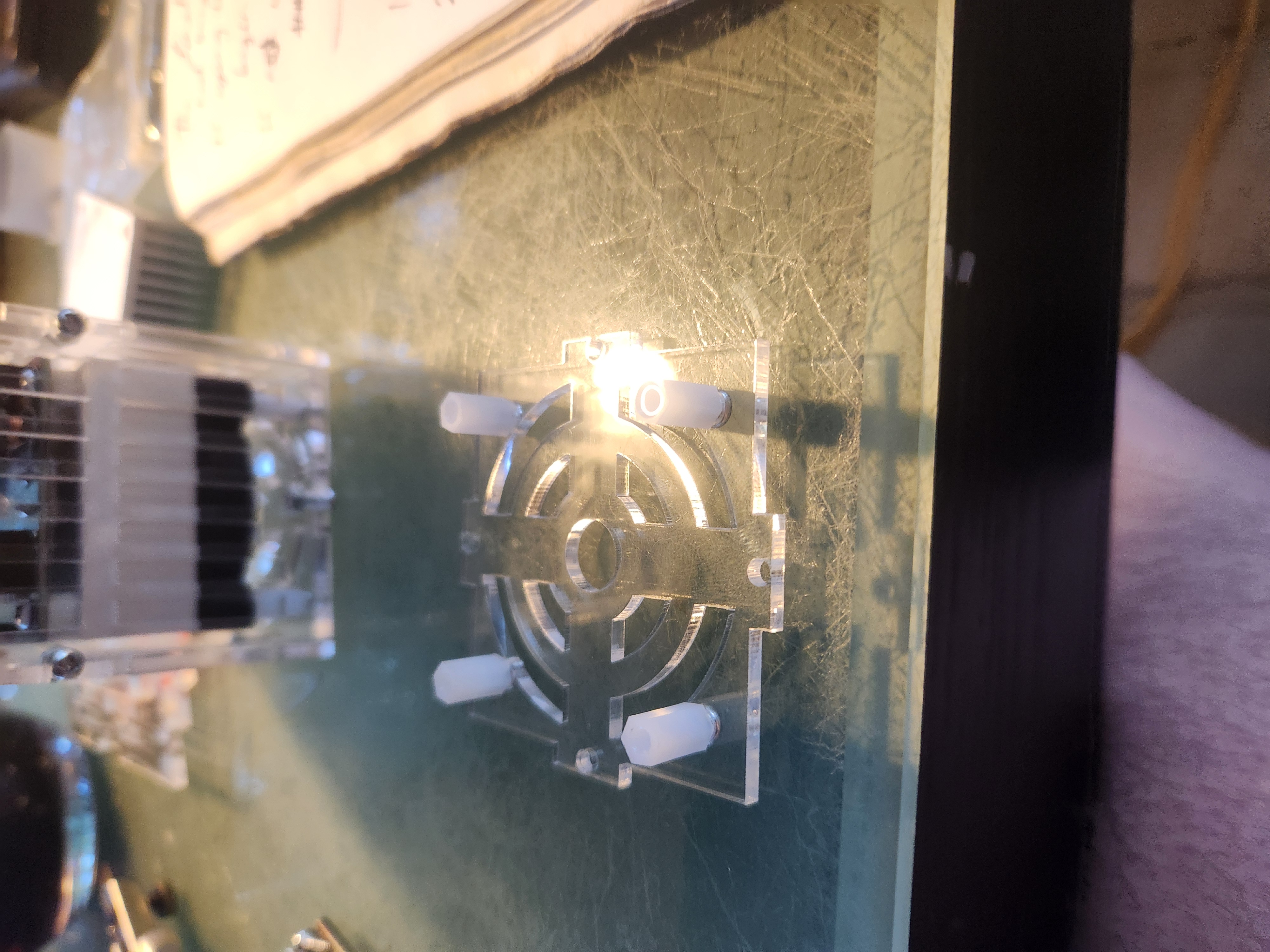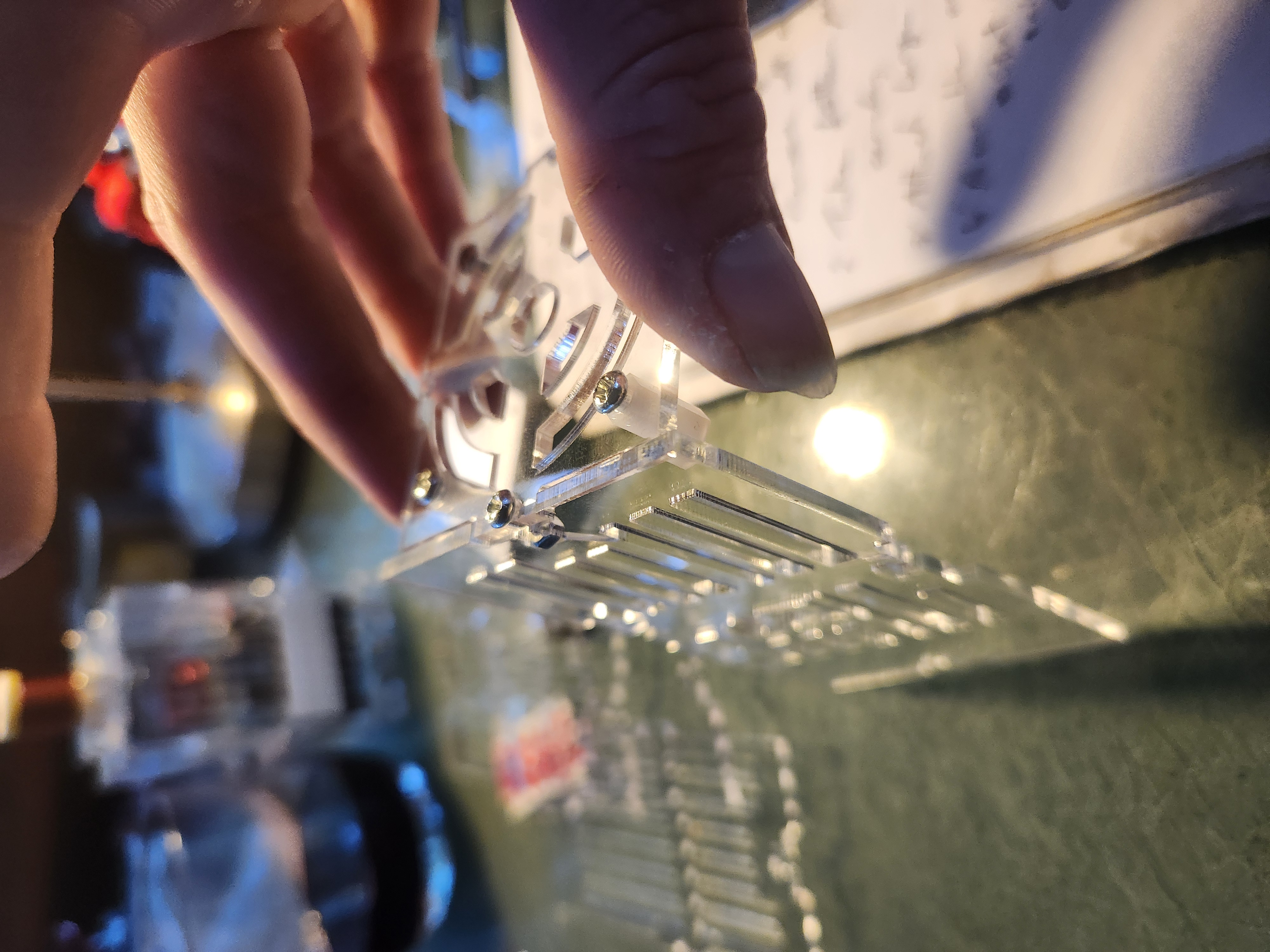 Take the remaining square piece of acrylic and put it into the top (don’t add nuts and bolts yet). The hole at 45° should be approximately inline with the rectangle containing the two 90° pins.