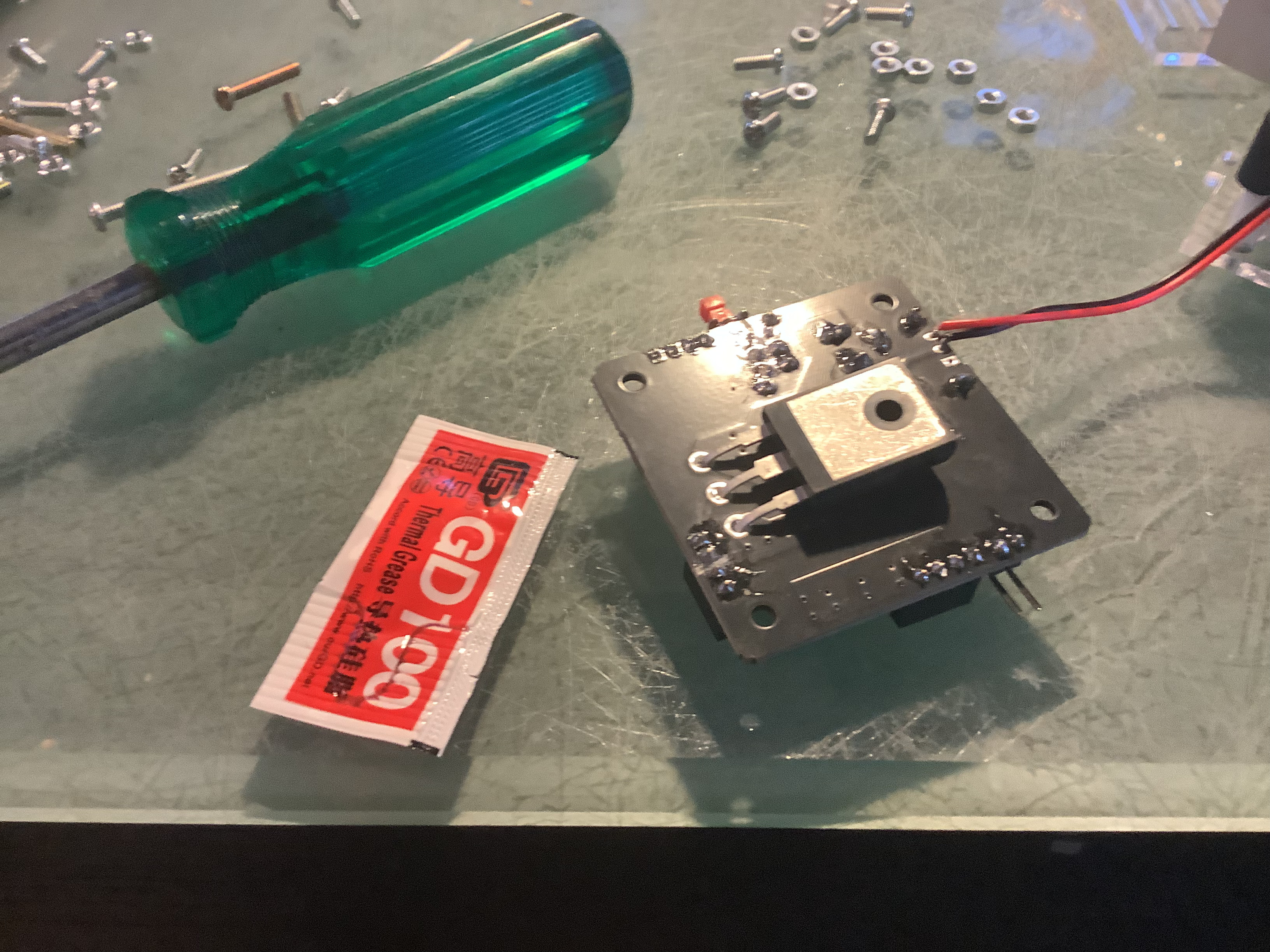 Open the thermal paste and apply it liberally to the silver side of the MSOFET. From here on be careful not to rub in on too many things!