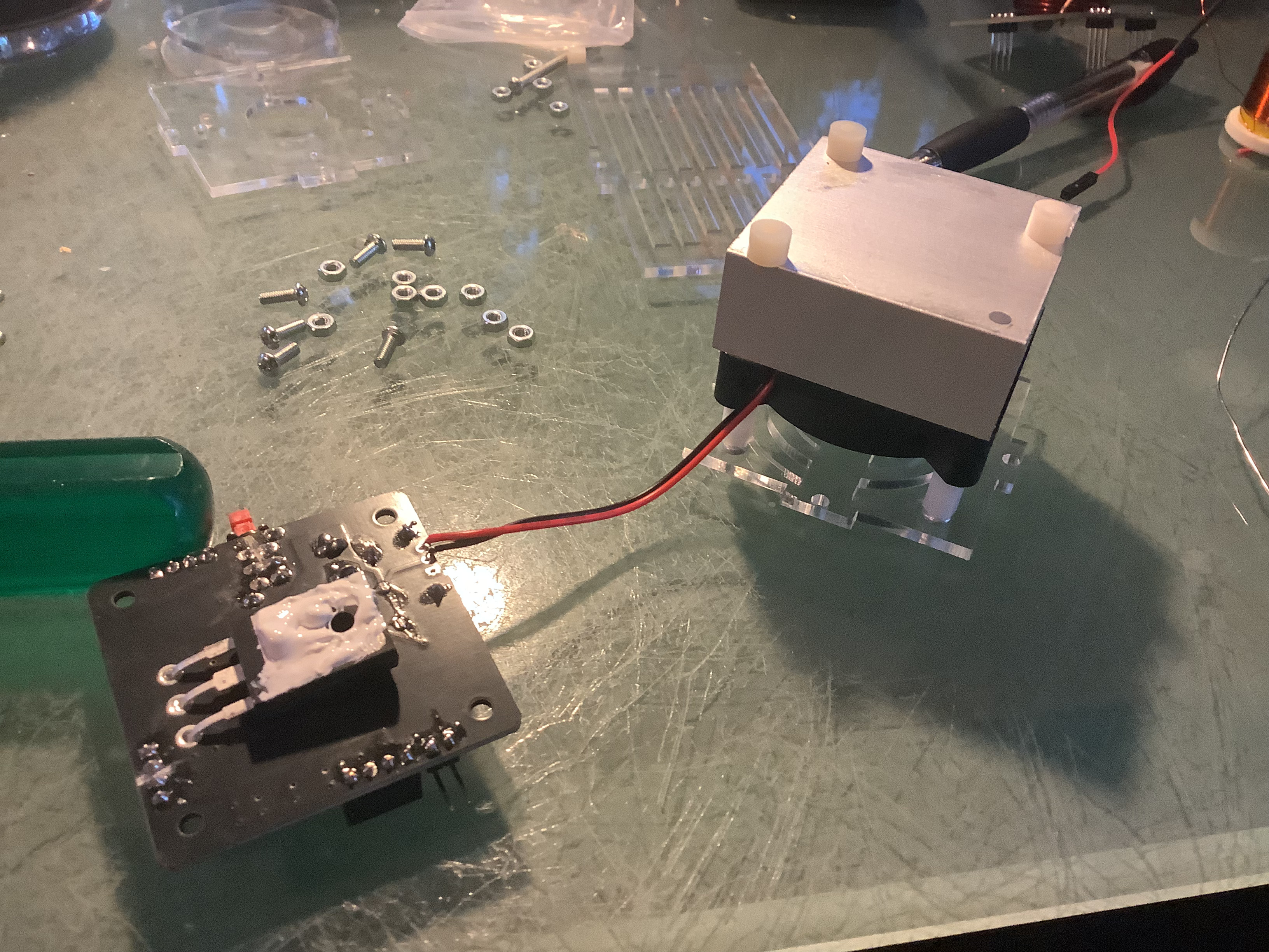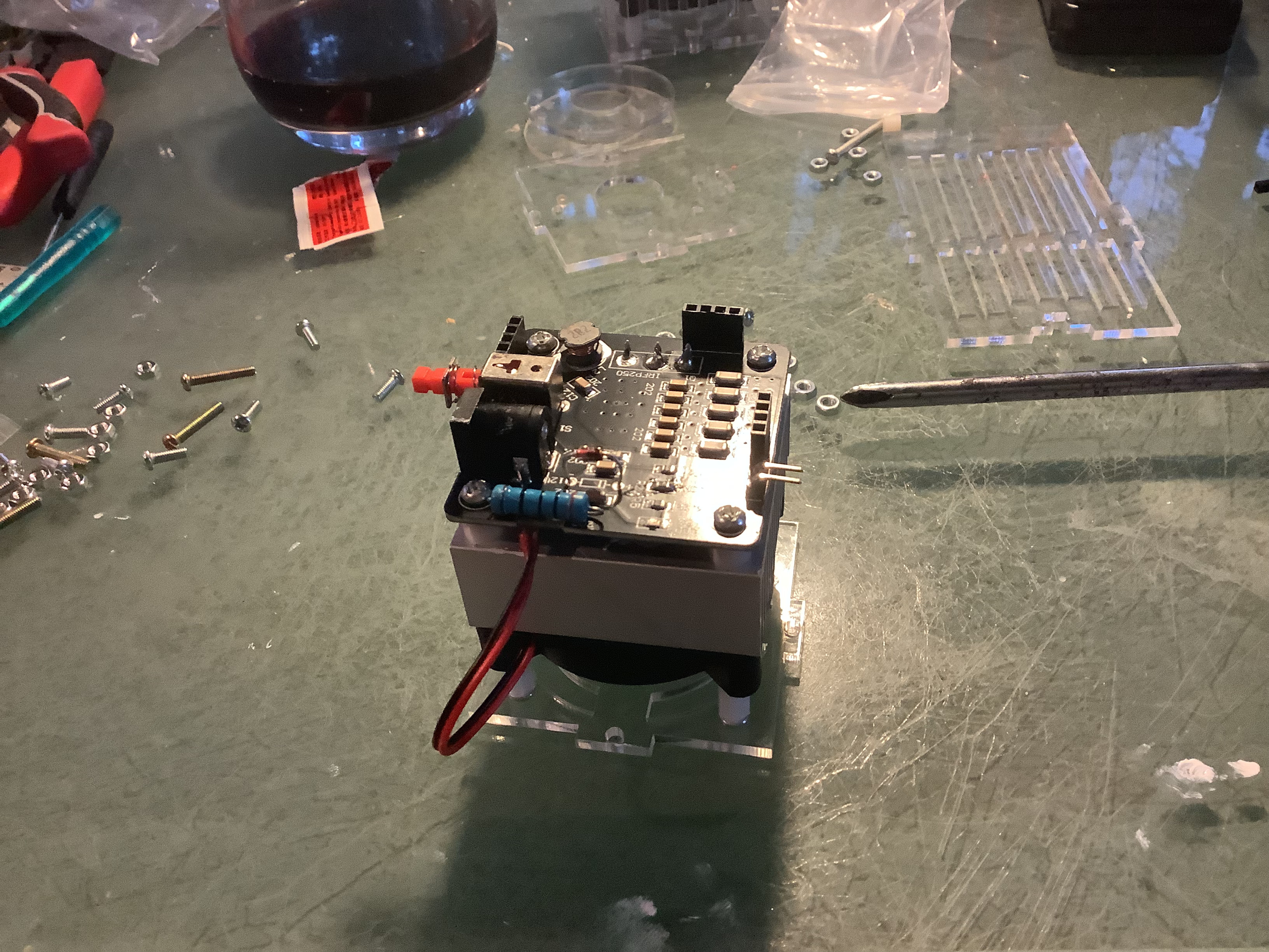 Place the fan inside the case, on top of the spacers. It is important that the screw plugs are facing down, and that the fan is rotated so that, when looking at the power button, the fan’s wires come out the right side of the case. Next, place the heat sink on top of the fan, fins facing down. Take four small white plastic spacers and place them in the corners, lined up with the heat sink’s screw holes. Finally, add the driver PCB to the stack. This should be rotated so that the large resistor is directly above the fan wires, and the button and power socket fit through their holes.
