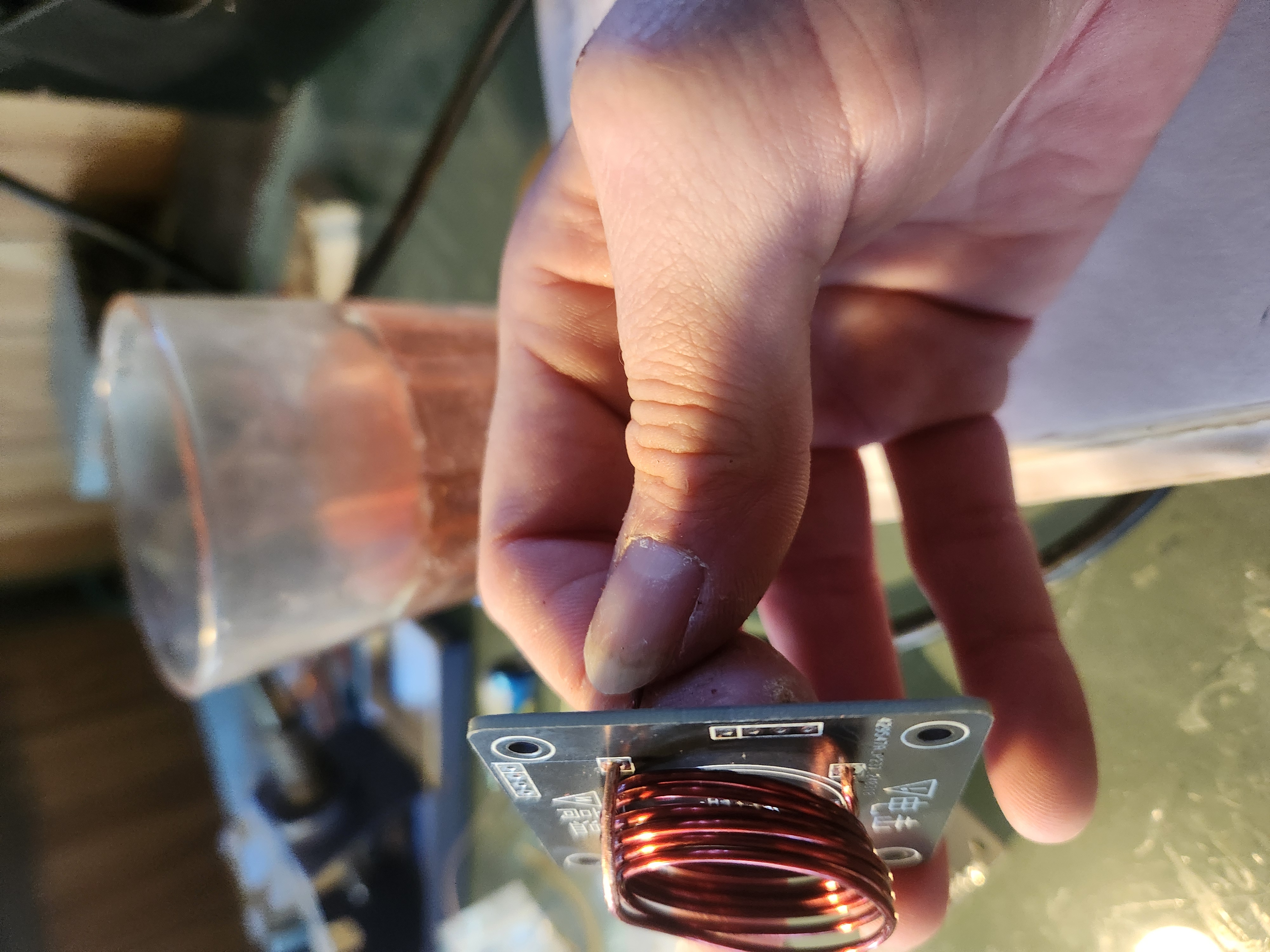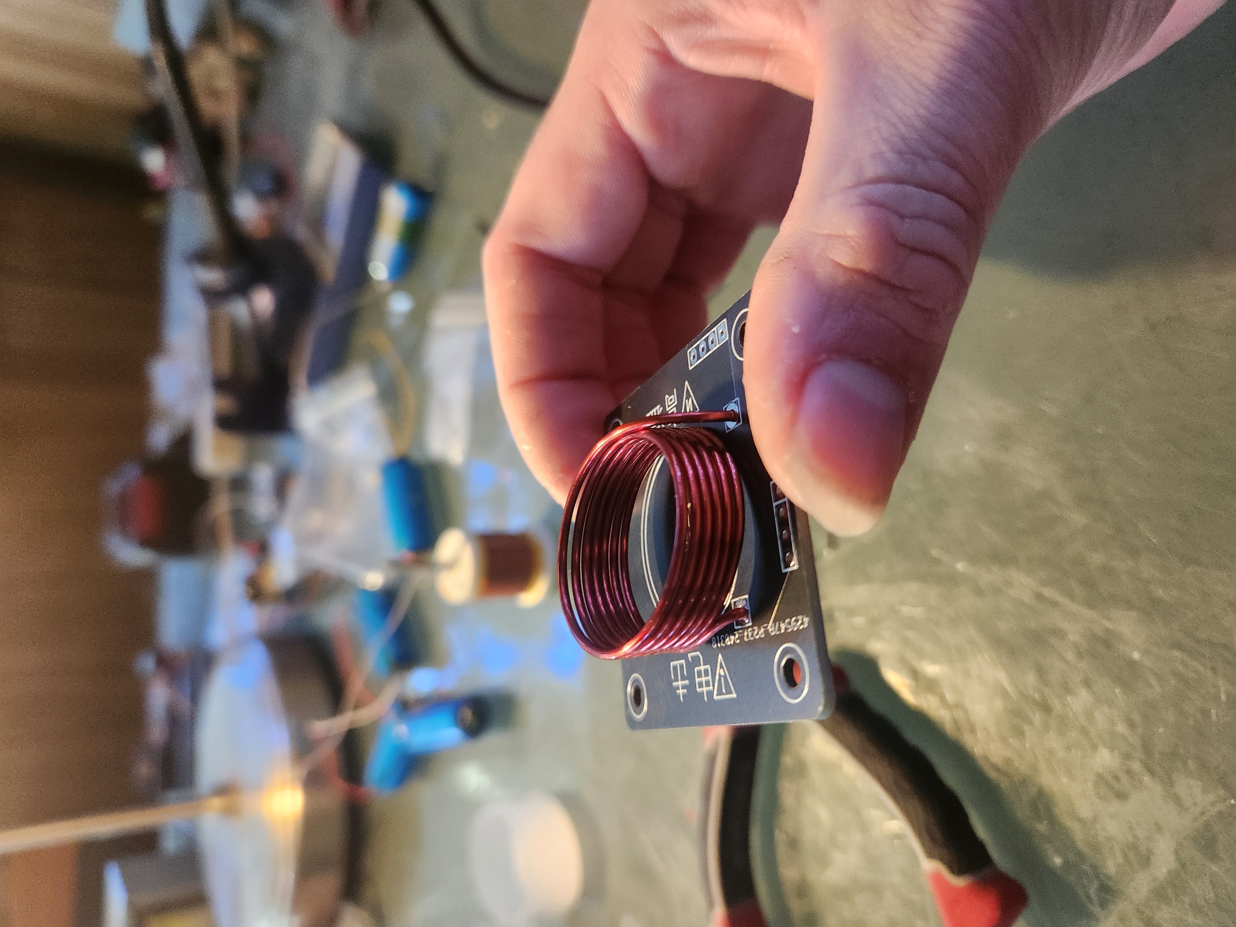 Take the primary coil - the small coil made from relatively large wire - and shape it so that it fits reasonably into the holes on top of the primary PCB. It doesn’t need to be perfect, as long as it remains a coil without excessive horizontal or vertical gaps.